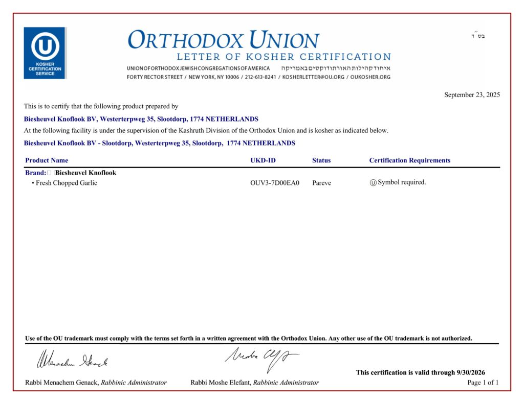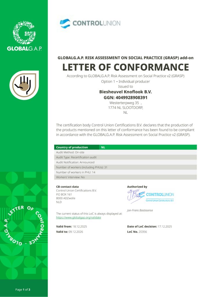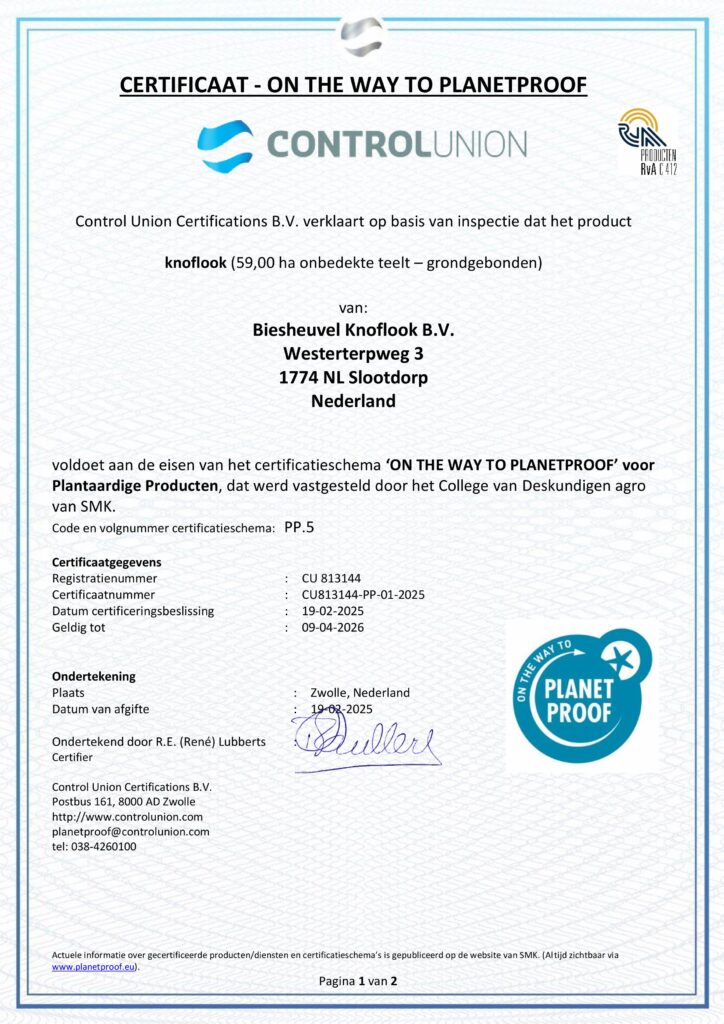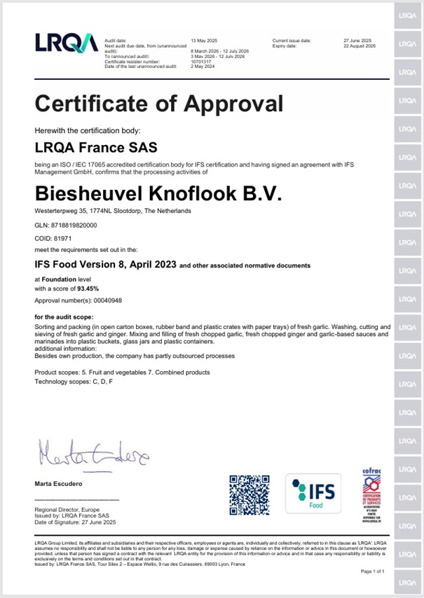 Biesheuvel Knoflook is GlobalG.A.P., IFS, Skal, GRASP, Kosher en PlanetProof gecertificeerd.
