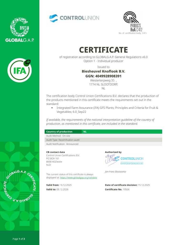 Biesheuvel Knoflook heeft de benodigde certificeringen voor het telen, verwerken en verkopen van verse knoflook.